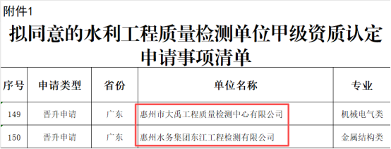 近日,水利部2025年度水利工程質(zhì)量檢測(cè)單位甲級(jí)資質(zhì)認(rèn)定評(píng)審結(jié)果公示,惠州水務(wù)集團(tuán)下屬大禹檢測(cè)公司、東江檢測(cè)公司雙雙傳來(lái)捷報(bào),資質(zhì)建設(shè)實(shí)現(xiàn)里程碑式突破。