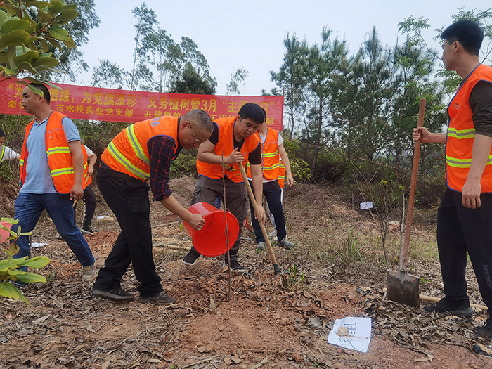 隨后,全體人抵達(dá)植樹點開始植樹?;顒蝇F(xiàn)場,大家熱情高漲、干勁十足,一起揮鍬鏟土,將一株株樹苗植入樹坑,扶苗填土、培土圍堰、提水澆灌,各個環(huán)節(jié)銜接有序,呈現(xiàn)出一派緊張有序的繁忙景象,充分展現(xiàn)了黨員干部們奮勇拼搏和團(tuán)結(jié)協(xié)作的精神狀態(tài)。經(jīng)過近2小時的共同努力,一株株種植移栽的樹苗亭亭玉立,迎風(fēng)搖曳,給庫區(qū)增添了新綠,帶來了春日蓬勃的希望。