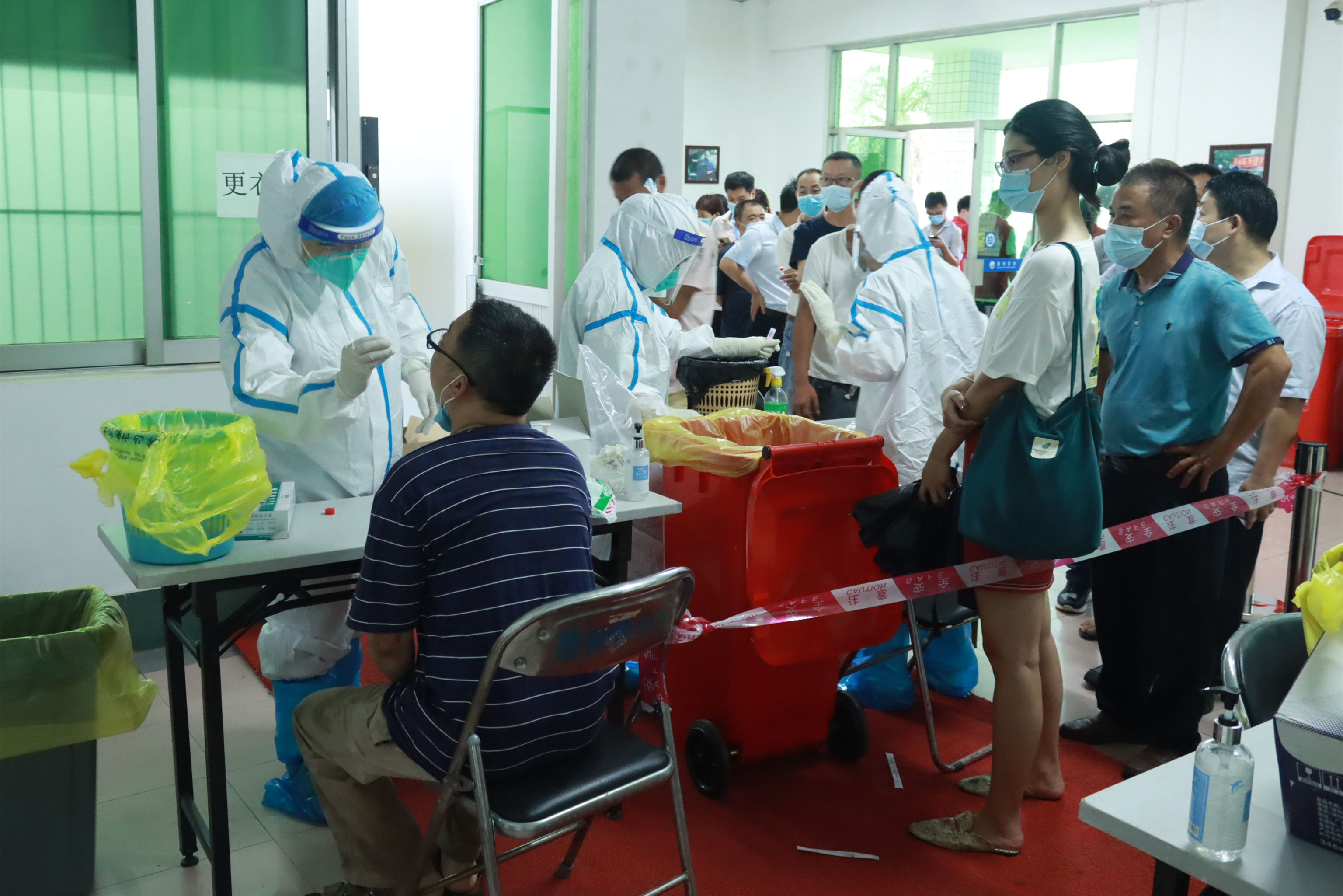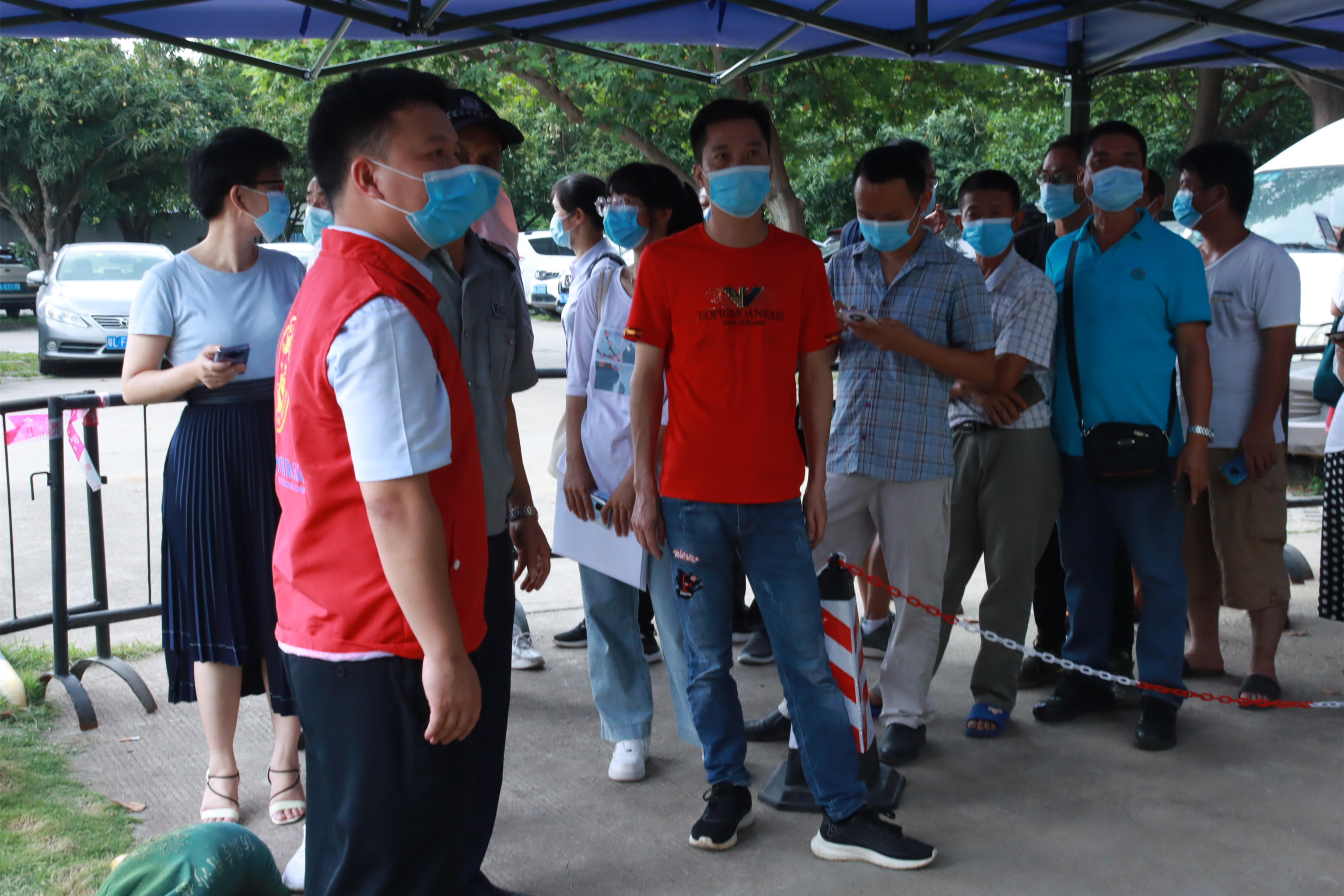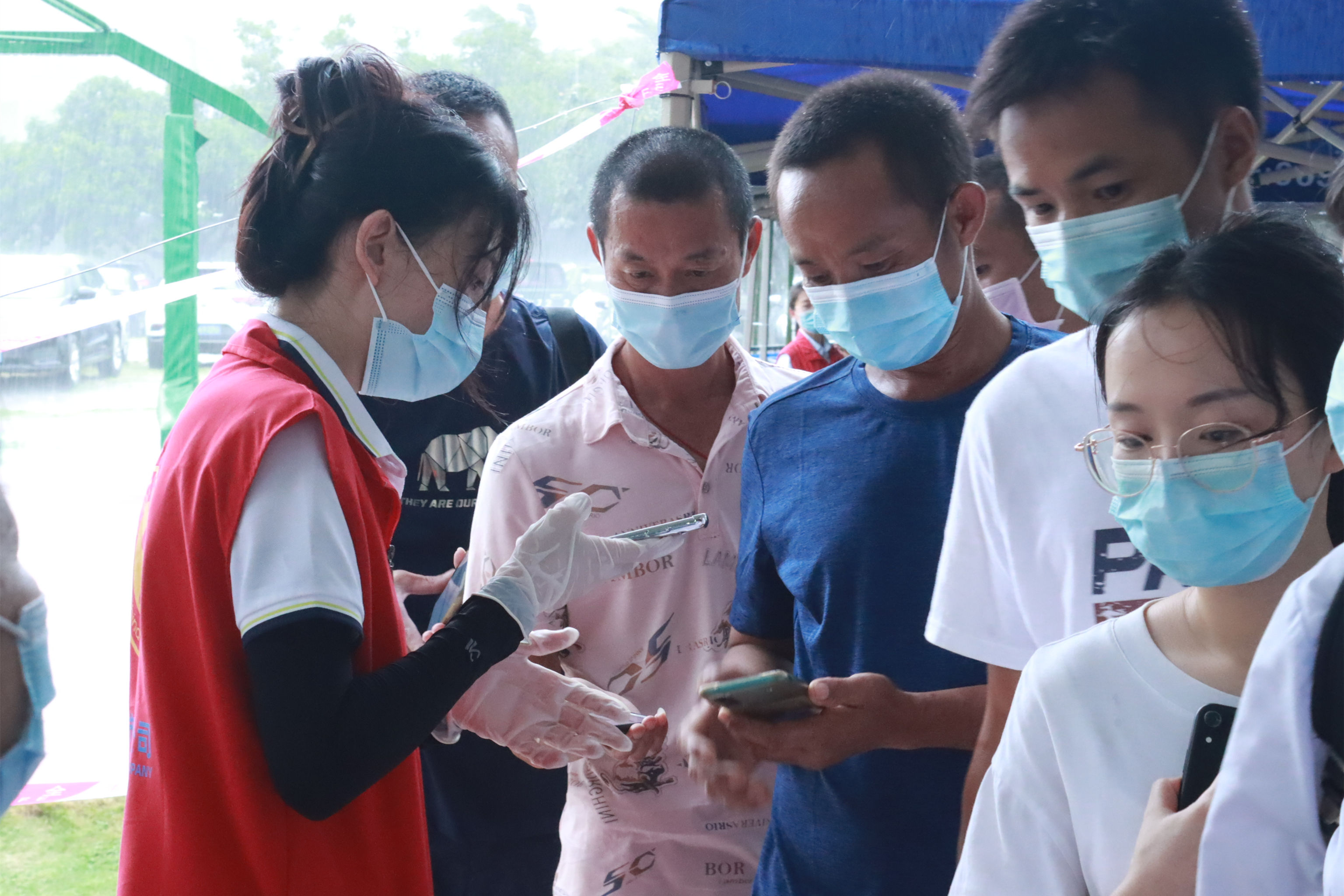 “請等候區(qū)的員工提前出示當(dāng)天的粵康碼、行程卡以及核酸檢測碼,10人為一組有序進(jìn)行檢測。”排隊(duì)等候區(qū),志愿者一遍遍提醒著受檢人員。是日,天氣變化多端,上午異常悶熱,下午又下起了傾盆大雨。志愿者們分信息錄入、現(xiàn)場引導(dǎo)、聯(lián)絡(luò)員以及機(jī)動協(xié)調(diào)4個(gè)組,有的負(fù)責(zé)聯(lián)絡(luò)各受檢單位,有的對受檢人員有序引導(dǎo),有的仔細(xì)核對及錄入人員信息,共同協(xié)助順利完成采樣。